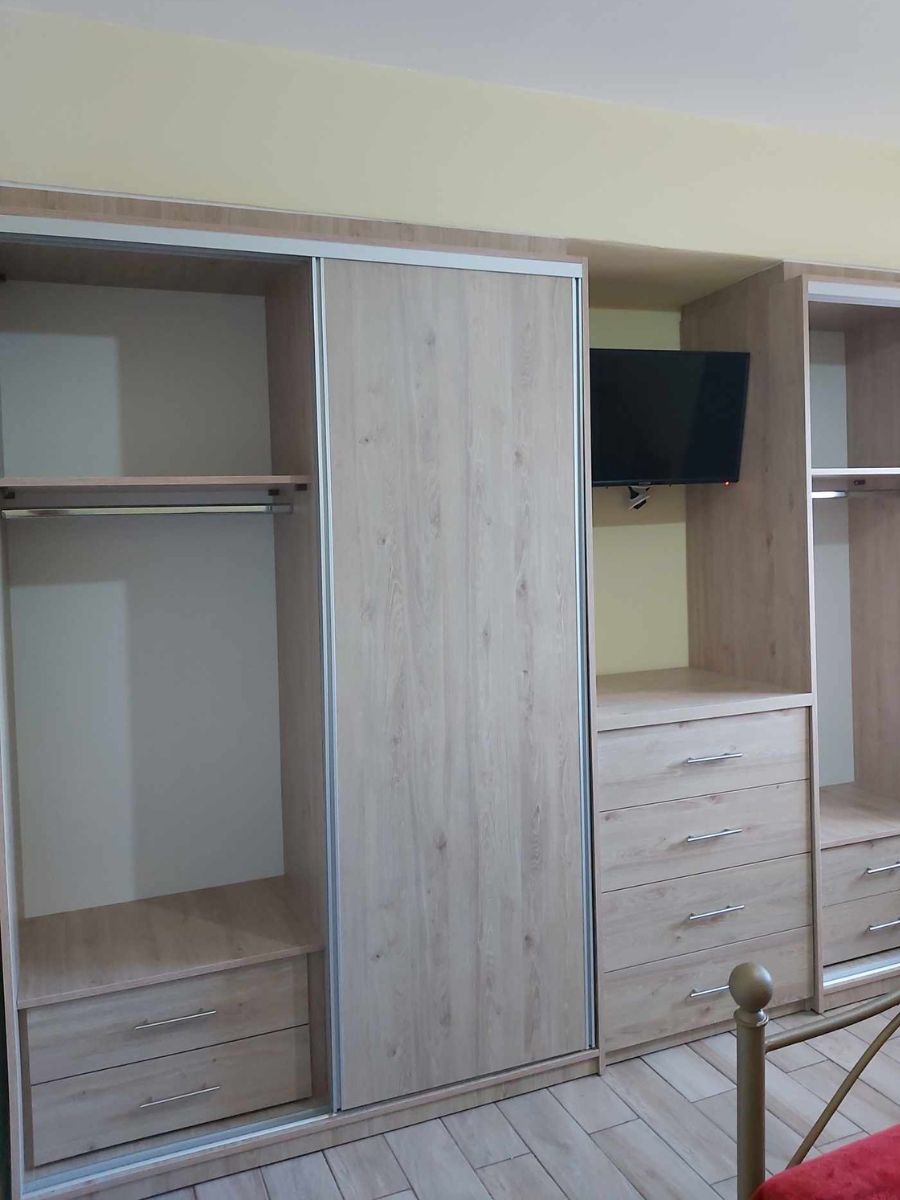 Στο εσωτερικό περιλαμβάνει βέργα για κρεμάστρες,ράφια καθώς και συρτάρια.